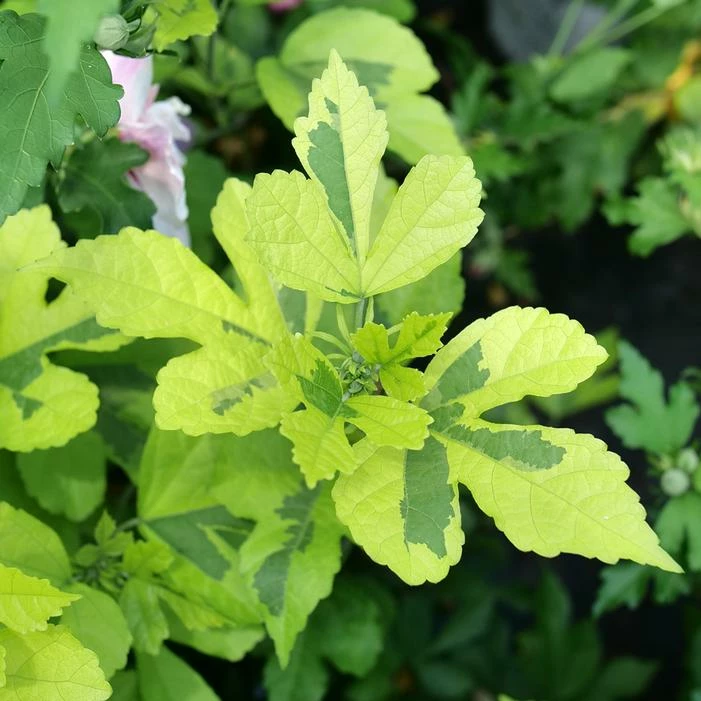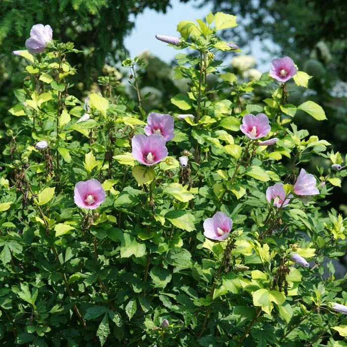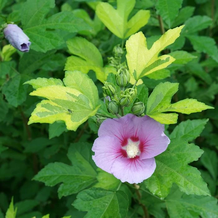 Buy Paraplu Adorned™ Althea online. Featuring striking color patterns, the leaves emerge bright yellow in spring, then transition into dark green centers, and then finally darkening to solid dark green. Not only does this magical change appear on the leaves, but the shape of each leaf resembles a trident which further adds interest to this shrub. In summer, large lavender to purple single flowers with dark red centers appear and are a favorite for bees! Note: Althea is considered a woody shrub or tree and will not die back to the ground in winter like hardy hibiscus.