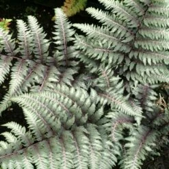 Buy Pewter Lace Fern online. An exceptional Japanese Painted Fern with pewter metallic foliage. The deeply contrasting mid-rib in purple/burgundy is a nice plus. Tolerant of heat and humidity (will need moisture in the south). Likes a rich fertile soil. Combines well with Tiarella and Hosta.