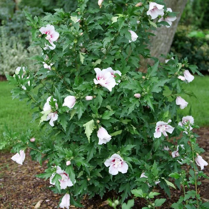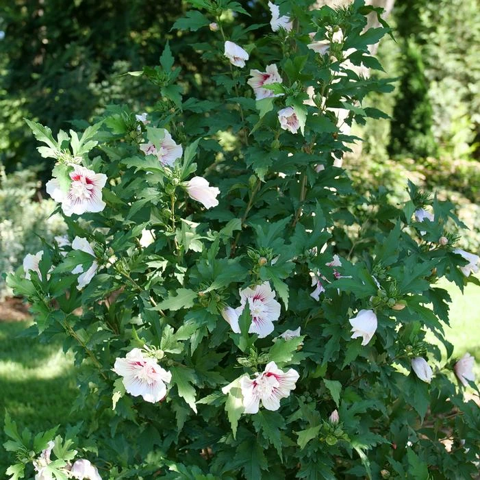 Buy Starblast Chiffon™ Althea online. A stellar plant with large, pure white flowers artistically inked with outwardly radiating red and pink veins to create a festive flower unlike any other. The flowering starts early and continues on much longer than others. Gardeners and landscapers alike will appreciate the low seed set. Note: Althea is considered a woody shrub or tree and will not die back to the ground in winter like hardy hibiscus.